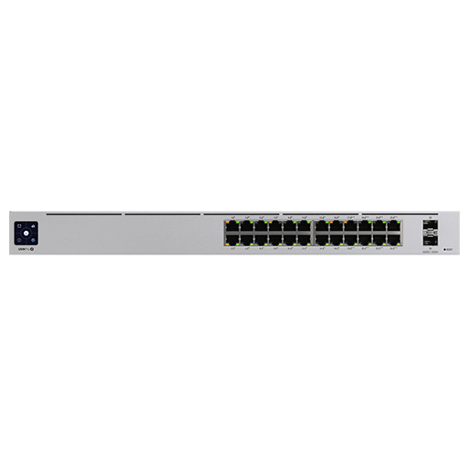 Ubiquiti’s USW-24P is a managed Layer 2 switch with 24x Gigabit Ethernet ports. It consists of 16x auto-sensing 802.3at PoE+ ports, 2x 1.25Gbps SFP uplink ports and a PoE budget of 95W. The unit features a 1.3″ touch LCM to provide status information.