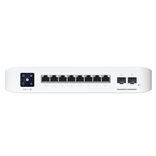 Ubiquiti’s USW-PRO8P is a fully managed 8-Port Gigabit Layer 3 UniFi switch. It has 6x 802.3at PoE+ Ports, 2x 802.3bt PoE++ Ports, 2x 10Gbps SFP+ and a PoE budget of 120W. It features innovative near-silent cooling and a 1.3″ touch LCM (Liquid Crystal Monitor) to provide status information.